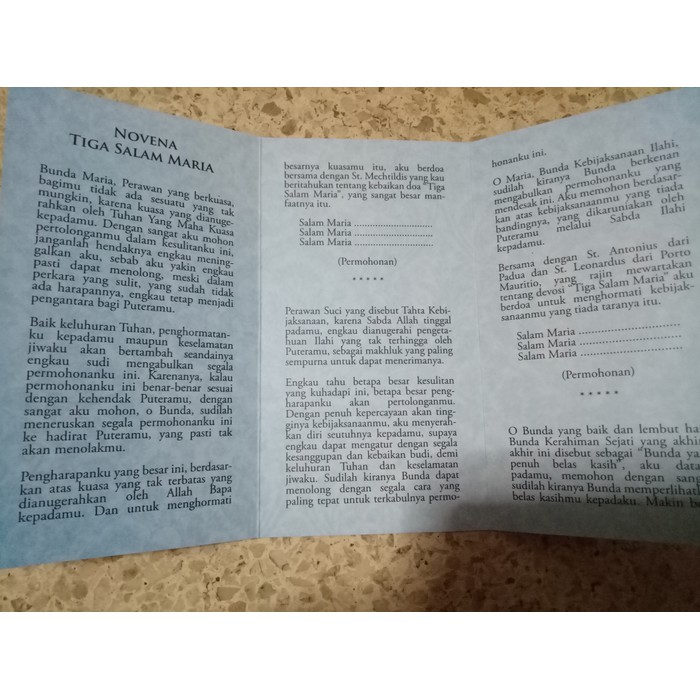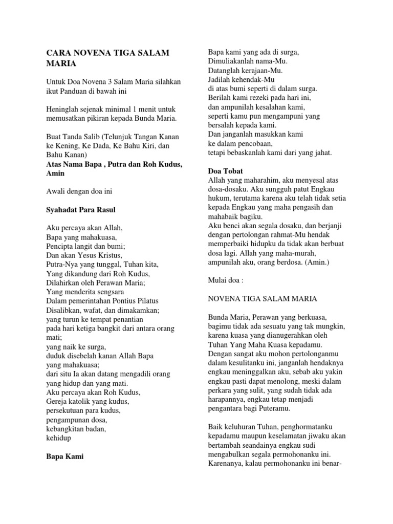 Ibadat Doa Novena 3 Salam Maria - Novena 3 Salam Maria : Berikut doa novena tiga salam maria, lengkap tata cara dan susunan doa:. (3 kali) doa wujud permohonan anda… bunda maria, bunda yang baik dan murah hati, jauhkanlah (diriku, dia, kami) dari dosa berat Ibadat novena tiga salam maria. (3 kali) doa wujud permohonan anda… bunda maria, bunda yang baik dan murah hati, jauhkanlah (diriku, dia, kami) dari dosa berat Santa maria, bunda allah, doakanlah kami yang berdosa ini sekarang dan waktu kami mati. Oct 05, 2019 · salam maria, penuh rahmat, tuhan sertamu, terpujilah engkau di antara wanita, dan terpujilah buah tubuhmu, yesus.